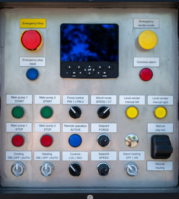 The winch and EHPU can be controlled from the operating panel on the power pack. It is also possible to use the controls installed in the dedicated operator container. For this, the existing control panel supplied by the customer was used and modified.